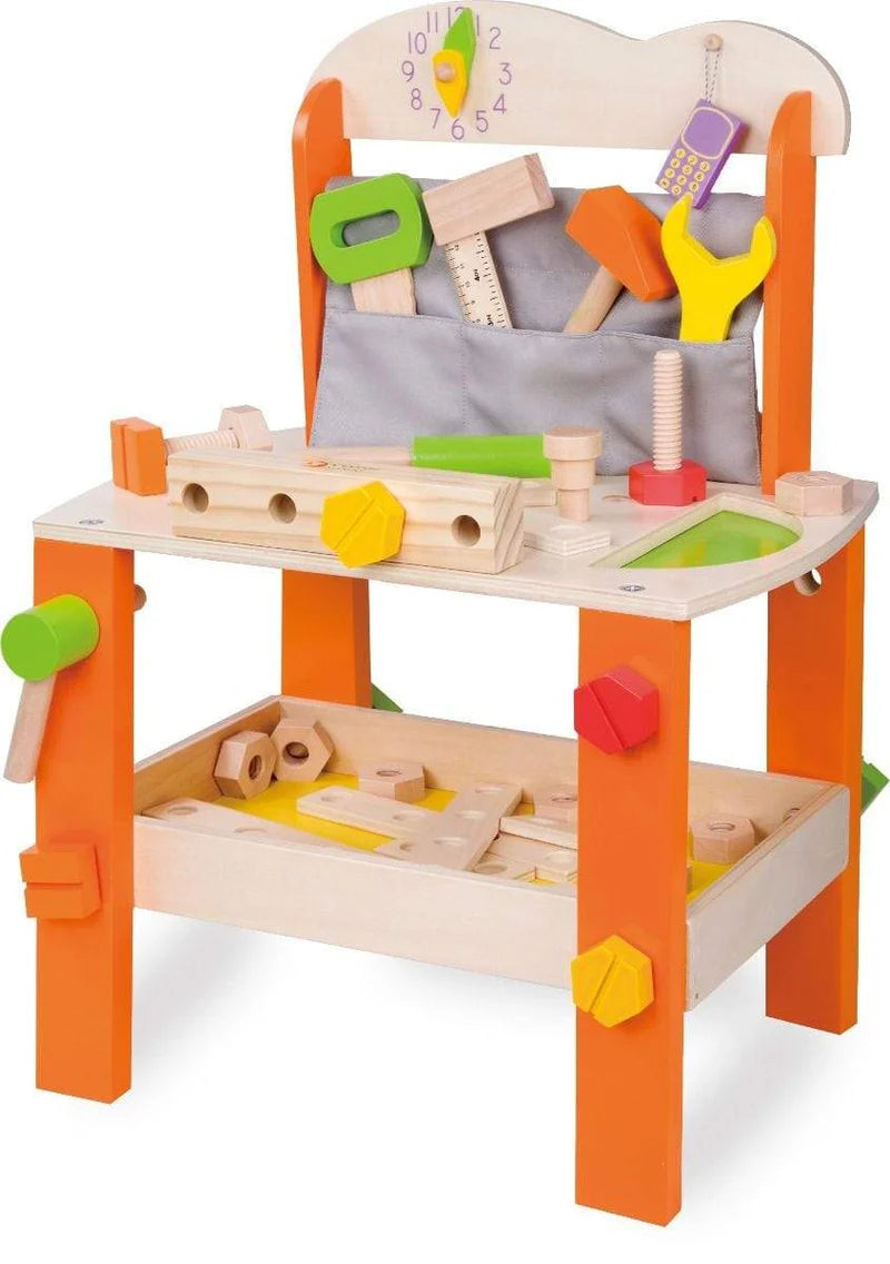 The carpenter tool bench playset contains various tools includes a hammer, a wrench, a ruler, a saw, nails, screws, nuts, bolts, etc. to simulate a real workbench that a carpenter needs.
