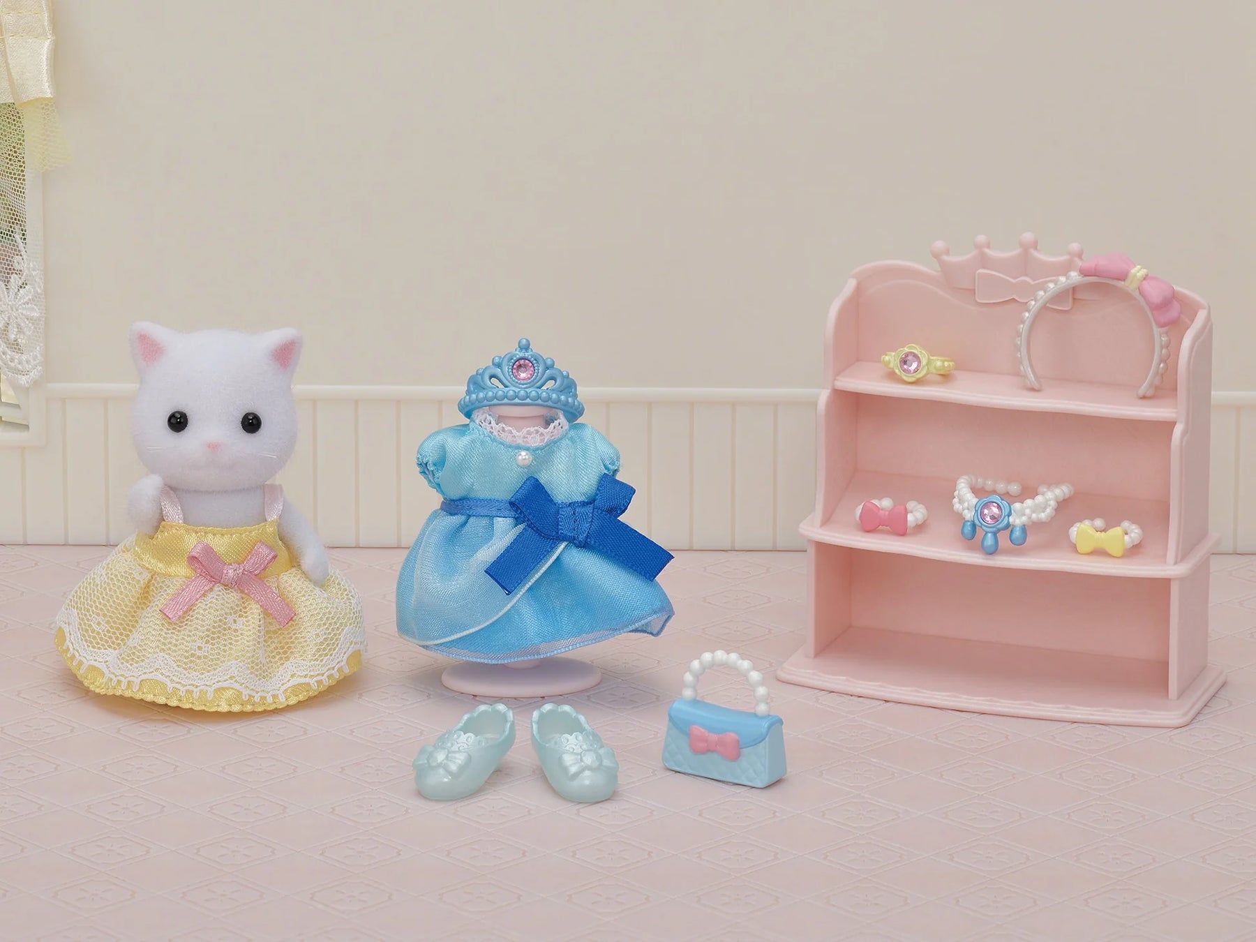 The Princess Dress Up Set contains Persian Cat girl Lyra, with a lovely yellow dress, a separate blue dress, fashion accessories, and furniture. Mix and match dresses, tiara, accessories, and shoes, to give your Sylvanians a princess makeover! The accessories can be displayed on the shelf. The dress can be placed on the mannequin. The tiara, necklace, and earring feature shiny rhinestones.