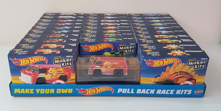 New Mini Maker Kitz are the Hot Wheels cars you build! Check the stats, pop out the parts, snap them together and get ready to race! Pull back to power up with super fast performance. They even work on Hot Wheels track, so you can create the ULTIMATE stunt! Once assembled the Car is robust and has a super-fast pull-back motor for racing on any flat surface or Hot Wheels track.