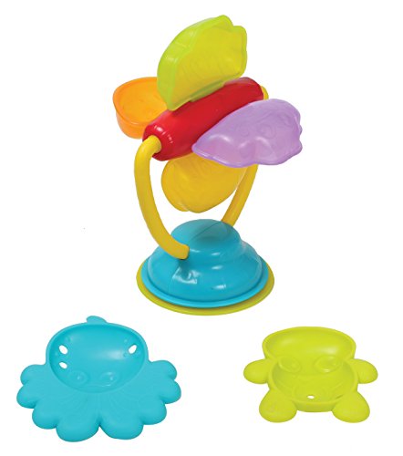 Splish, splash fun with the Deluxe Spinning Bath Wheel! The suction base easily attaches to the side of the bath. Baby can watch engaging characters spin around & around when water poured on them. Two scooping cups are included for water play, with an array of different holes for water to pour through.